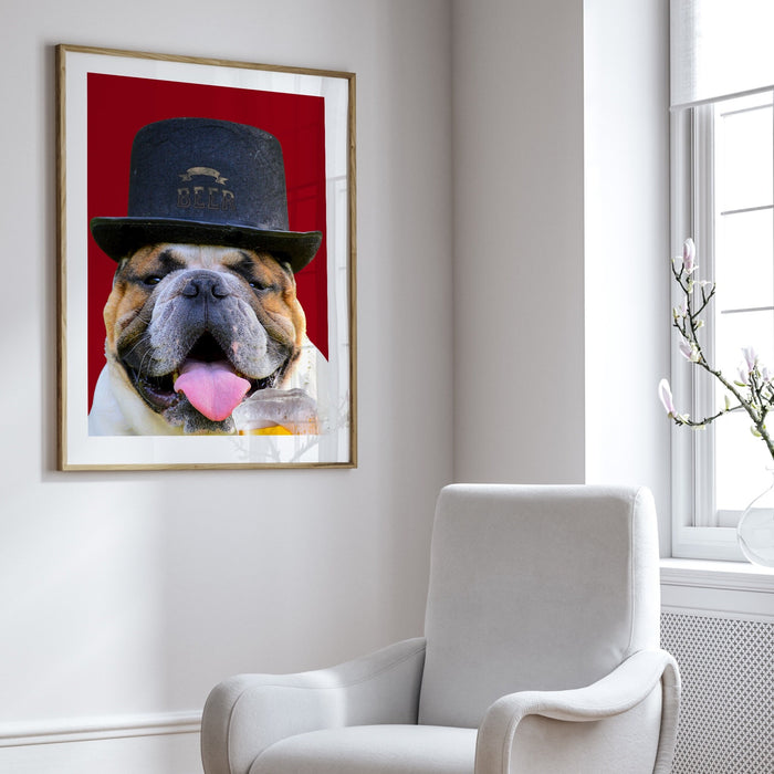 Fun print of a British Bulldog smiling in a hat. Great for adding a bit of life and joy to any area. A very British sense of humour. Perfect for your lounge, bedroom, Game room or dorm room art.