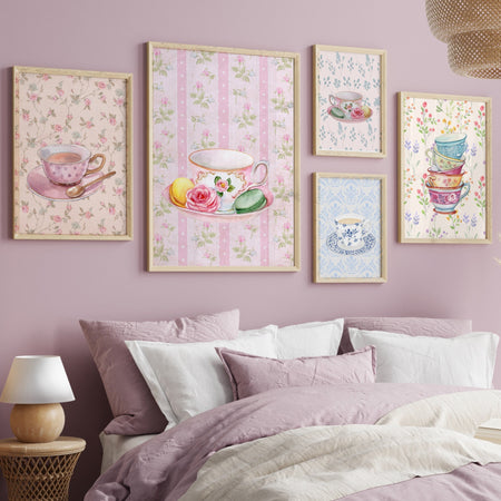 Coquette Pink Print Vintage Teacup Cute Flowers Kitchen Art Coffee Digital Download Retro 70s Poster Cottagecore Decor Printable set of 12 $12.00