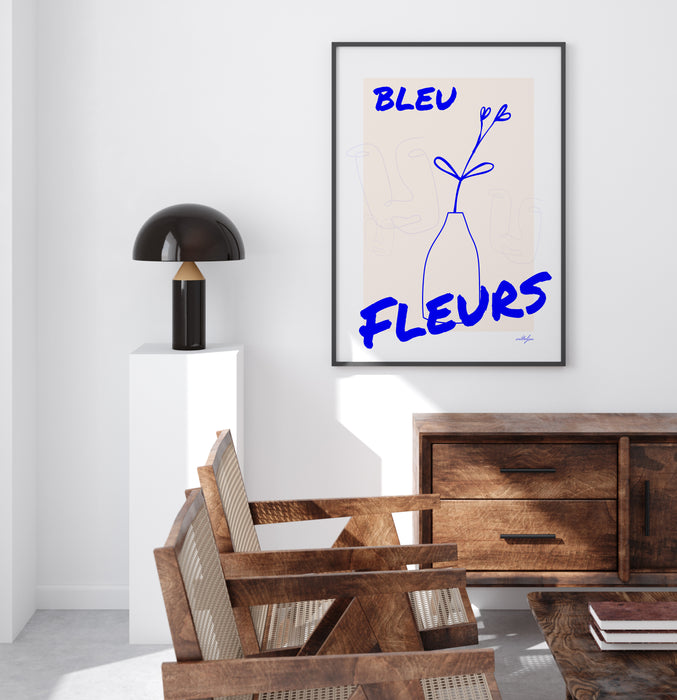 Bleu Fleurs by saltedjam. This original print features illustrations of floral and transparent face figures, with a contrast of bold graphical type in a monochromatic electric blue hue giving simplicity to the motif.