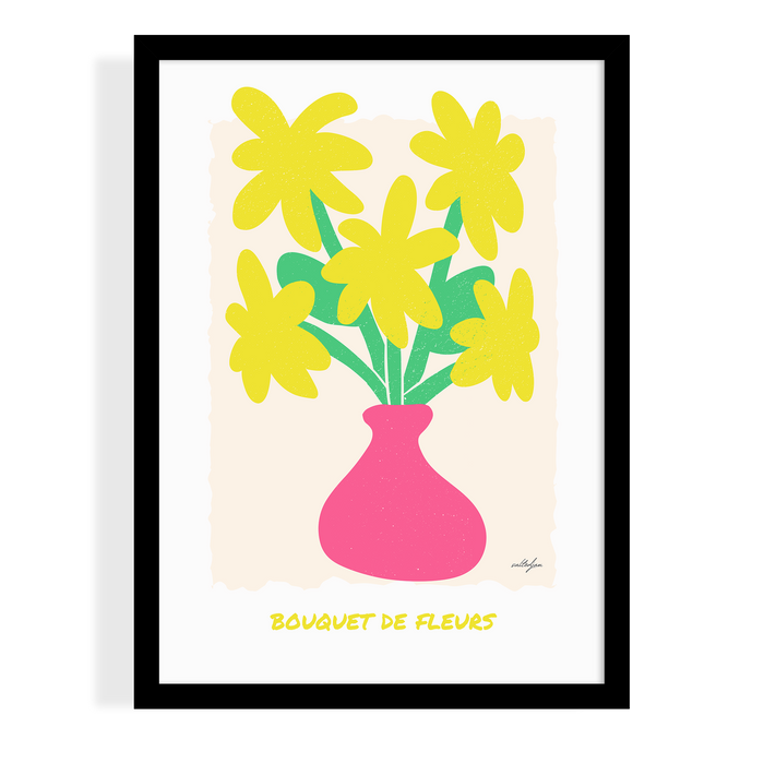 Bouquet de Fleurs No.2 by saltedjam. This original graphic illustration features figurative shapes that depict a flower bouquet and vase in bold colours. The contrasting colour combinations within the piece create a playfulness to the motif.