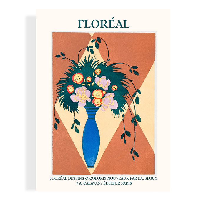 The design consists a thin, long blue vase, holding a bundle of stylised yellow, purple and red flowers with leaves, coloured with dark green sitting on a cream and light brown lozenges pattern background. Floréal Pl. 7 is an enhanced version of the original design which is currently stored within The Metropolitan Museum of Art Collection