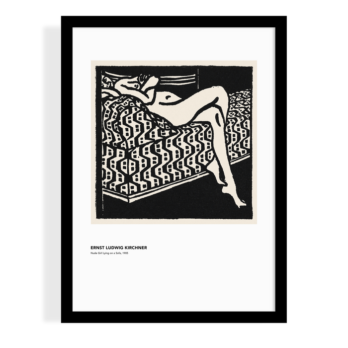 Nude Girl Lying on a Sofa by Ernst Ludwig Kirchner. This vintage 1905 woodcut piece by German artists Ernst Ludwig Kirchner, features a nude female lying down with her legs crossed on geometric patterned sofa printed in black. Nude Girl Lying on a Sofa is an enhanced version of the original woodcut print which is currently stored within The National Gallery of Art.