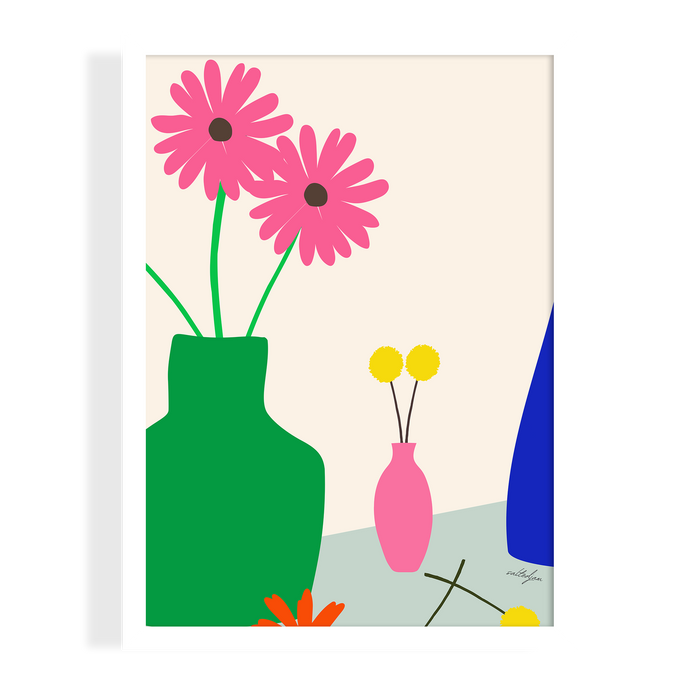 The Flower Stall No. 2 by saltedjam. This original botanical print illustrates a minimalist close-up take on floristry. The bright colour tones alongside the soft background hues make for the perfect playful piece to add to your collection. This print can be brought as an independent piece or paired with The Flower Stall No. 1 as an interconnected set.