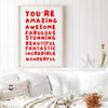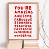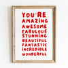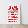 You're Amazing! This digital download prints look great in ant room. You can print from big too small in all sizes. Perfect for a lounge, dorm room or bedroom art or a gift for someone you love who needs a reminder of how wonderful they are. So easy to download and use.