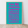 You Are Amazing Pink Turquoise Poster, Funky 70s Pink Wall Art, Digital Artwork,Printable, Girly Dorm Room Art Trendy Retro Digital Download