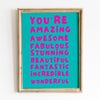 You're Amazing! This digital download prints look great in any room. You can print from big too small in all sizes. Perfect for a lounge, dorm room or bedroom art or a gift for someone you love who needs a reminder of how wonderful they are. So easy to download and use.