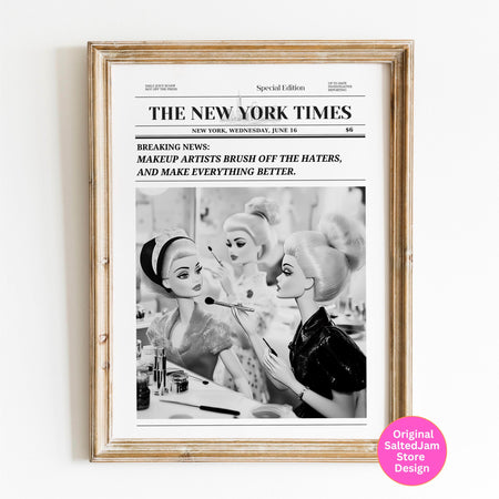 Trendy newspaper print makeup artist wall art preppy vintage wall decor, funny dorm decor, bar cart wall art retro doll funny printable $10.00