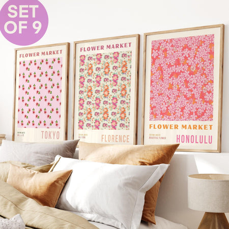 Pink orange flower market digital download, 70s style poster, 60s flower print, orange pink decor, dork room wall art, printable set of 9 $15.00