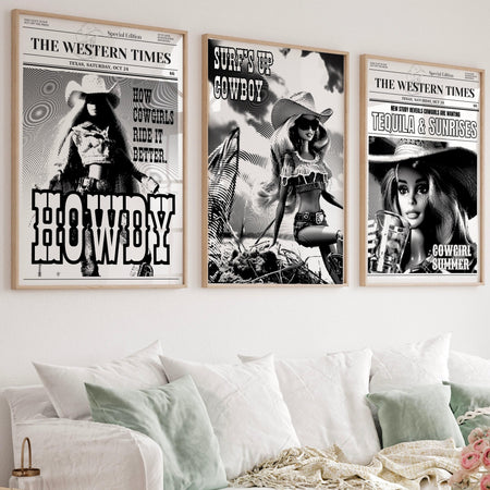Cowgirl wall art set of 3 black and white preppy vintage wall decor, funny dorm decor cowgirl boots. retro doll, funny printable p rint $7.50