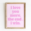 I love you more, the end, I win. This is a beautiful gentle reminder or a gift for a loved one. Perfect gift for birthday christmas or a special anniversary. This digital download prints look great in ant room. You can print from big too small in all of the prints. Both included to create a gallery wall. Perfect for a game room, lounge, dorm room or bedroom art. So easy to download and use.